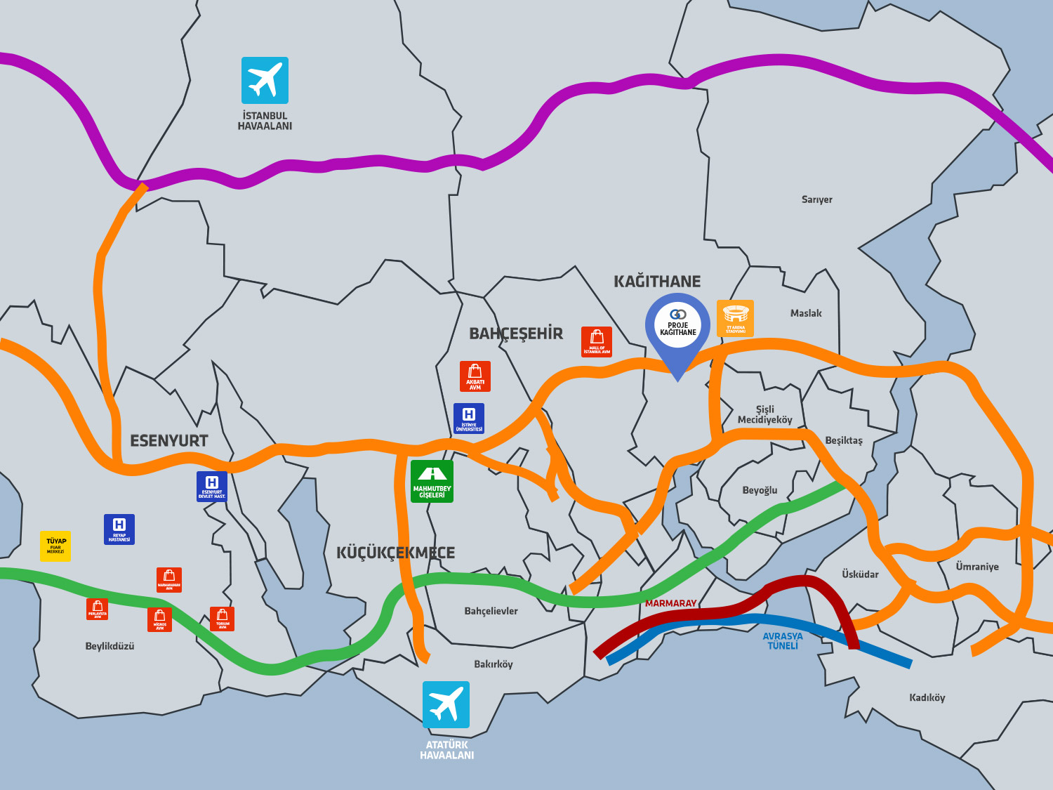 على مسافة مشي إلى المترو و القطار المُعلّق، و بالقرب من أكبر مراكز محط الأنظار في اسطنبول مثل لفنت و بيشكتاش و تقسيم. مفهوم الحياة اللامثيل لها مع المرج الأخضر والقناة الزرقاء...